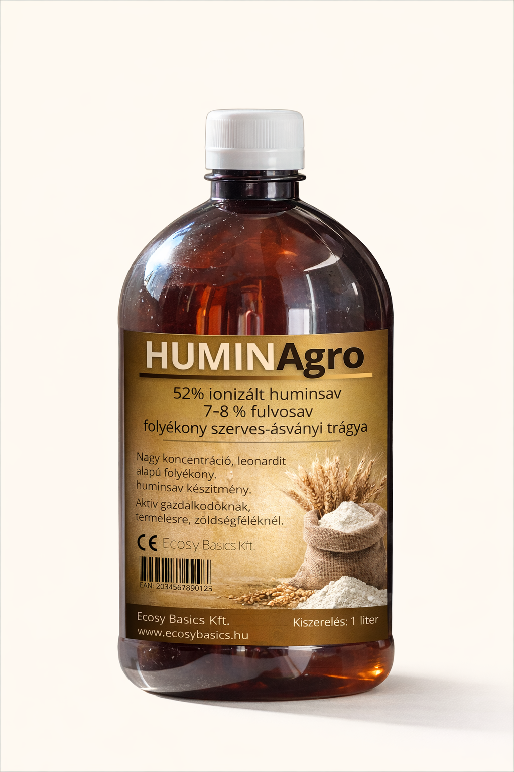 HuminAgro 1L is a high active ingredient liquid humic acid preparation distributed by Ecosy Basics Kft., which contains 52% ionized humic acid and 7–8% fulvic acid. The purpose of the product is to support soil life, promote better utilization of nutrients, and improve plant stress tolerance.