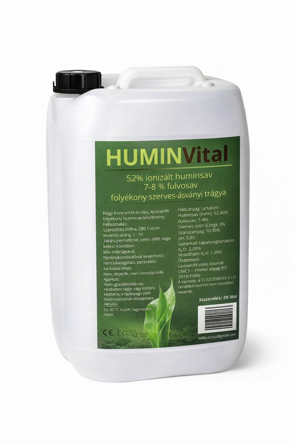 HuminVital 20L is a high active ingredient liquid humic acid preparation distributed by Ecosy Basics Kft., which contains 52% ionized humic acid and 7–8% fulvic acid. The purpose of the product is to support soil life, promote better utilization of nutrients, and improve plant stress tolerance.